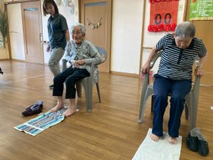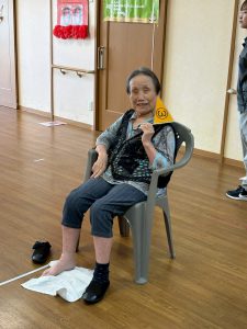 頑張って足の指を動かしますがタオルは動いてくれません!なんとか頑張って皆さん、ゴールできました!