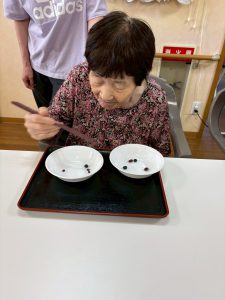 豆が3種類3粒ずつ、合計で9粒がお皿に入っています。これを全部、お箸を使って別のお皿に移したら次の人にバトンタッチです。これもなかなか難しい…!!